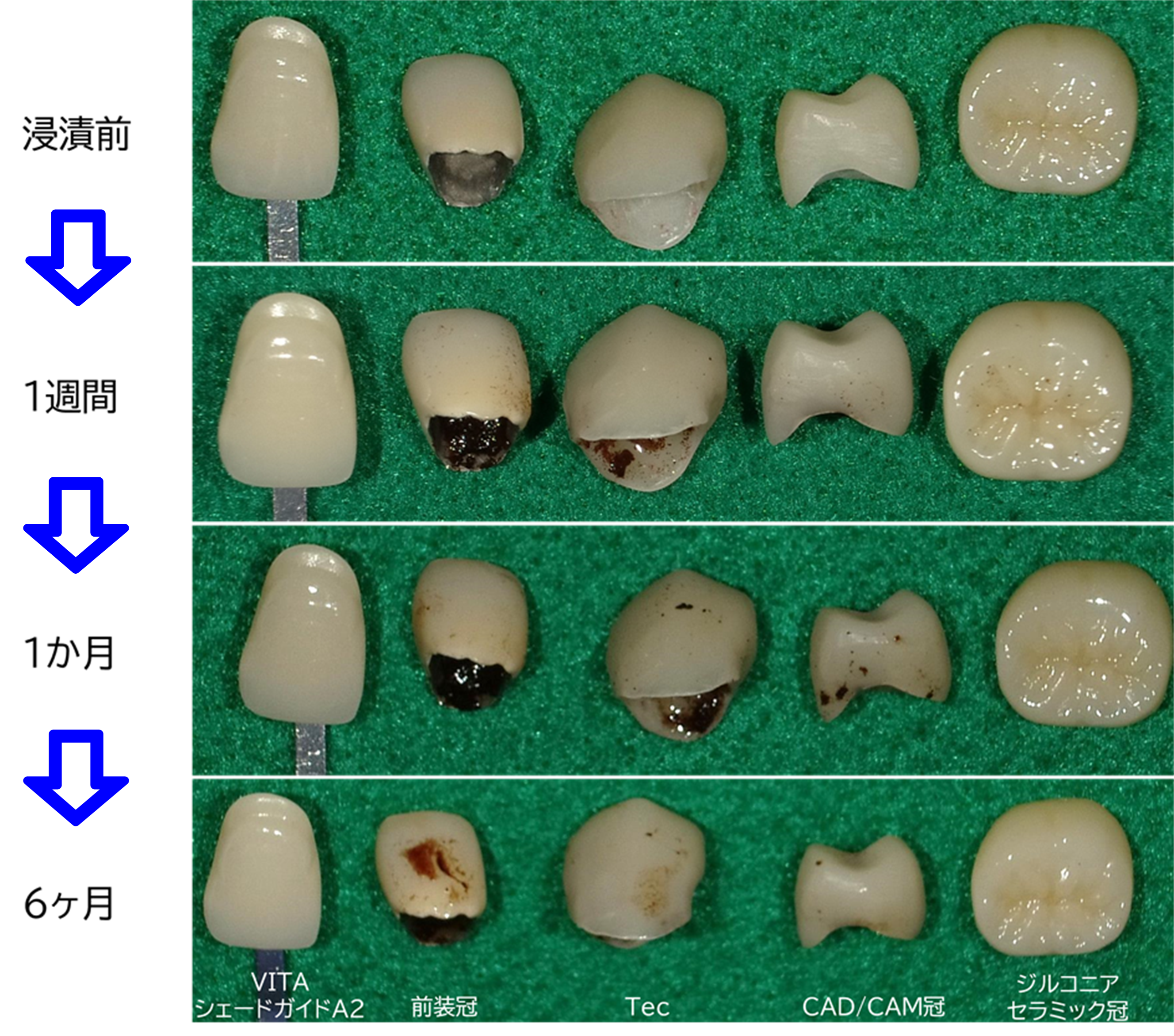 保険の代表的な材料と、自費のジルコニアセラミックを用いて、着色がどのくらい差があるのかを、同じ条件(赤ワイン溶液に浸漬)で実験しました。その結果は下の写真の通りです。